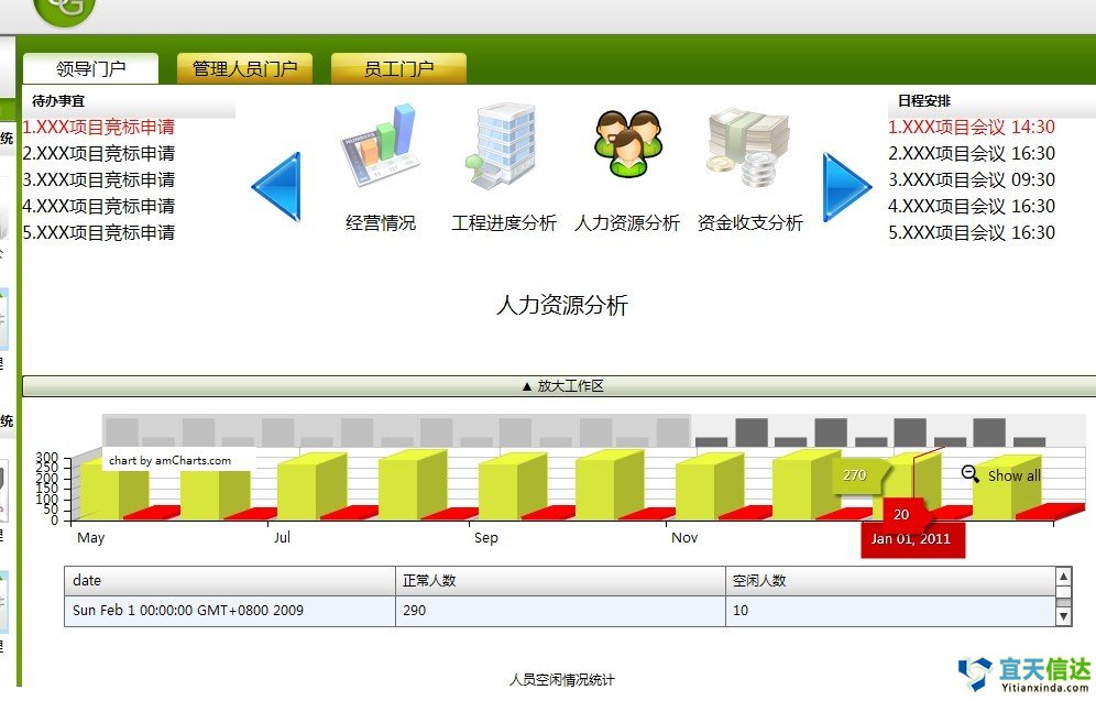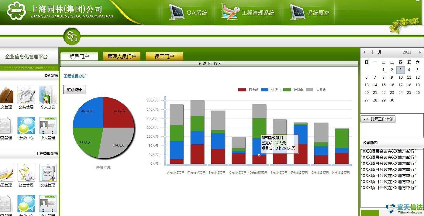 工作計劃管理可針對整個組織機構、部門或具體的工程項目進行管理。管理人員可以使用本功能制訂整個機構工作計劃、部門工作計劃或項目工作計劃,同時将這些計劃分解到具體的執行人員;並(bìng)可以随時檢查計劃的執行情況。員工根據分配到的工作計劃,可以定期上傳相應的工作報(bào)告,填寫工作日志,同時可以上傳相應的附件。