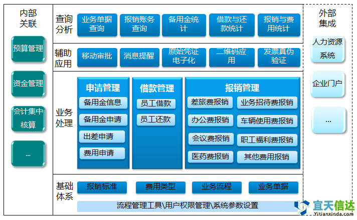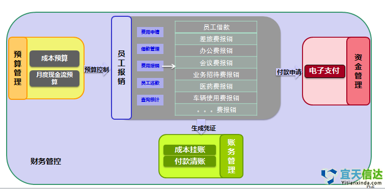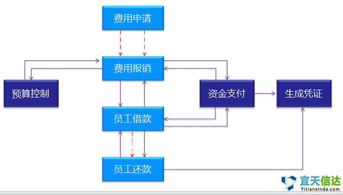 員工報(bào)銷其與預算管理模塊、資金管理模塊、賬務模塊無縫銜接。通過預算控制方案進行成本預算和現金流預算控制;對無需付款業務可以直接生成财務憑證;對於(yú)需進行付款的報(bào)銷業務,直接發起電子支付申請,付款後自動生成記賬憑證,提高核算和支付效率。