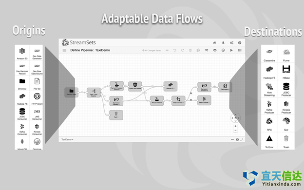 Google Data Flow爲數據相關的任務提供瞭(le)管理、監視和安全能力。Sources和Sink可在管線中抽象地執行讀寫操作,管線封裝而成的整個計算序列可以接受外部來源的某些輸入數據,通過對數據進行轉換生成一定的輸出數據。瞭(le)解詳情StreamSets:StreamSets是一種專門針對傳輸中數據進行過優化的數據處(chù)理平台,提供瞭(le)可視化數據流創建模型,通過開源的方式發行。該技術可部署在内部環境或雲中,提供瞭(le)豐富的監視和管理界面。