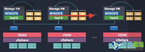 VNAS是運行在VMware虛拟中的一種NAS虛拟化服務,它的部署非常簡單,利用VSAN虛拟出來的硬盤,通過VMware的vSphere一鍵操作即可完成部署。其核心是達沃自主研發的分布式文件系統YeeFS,對外提供标準的NFS/CIFS接口,以及集群式NAS服務。由於(yú)它與VSAN運行在同一個宿主機上,即使VMs遷移瞭(le),還是可以實現對StorgeVM的就近訪問,與VMs位置無關。另外,通過創新數據調度等技術,VNAS提供全活集群的保障機制,因此當本地StorgeVM故障時,VMs仍可以通過其他Host上的StorgeVM繼續訪問相關數據。當然,VNAS對故障的判斷,需要VSAN提供相應的物理資源信息。